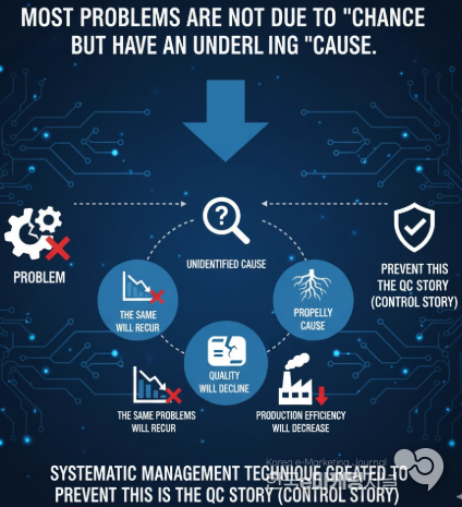 이를 방지하기 위해 만들어진 체계적 관리기법이 바로 QC 스토리(Quality Control Story)이다. QC 스토리는 현장의 문제를 논리적으로 해결하기 위한 절차를 표준화한 접근법이다.