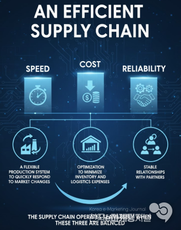 효율적인 공급망은 속도, 비용, 신뢰 세 가지를 중심으로 설계된다. 속도는 시장 변화에 빠르게 대응하기 위한 유연한 생산체계, 비용은 재고와 물류비를 최소화하기 위한 최적화, 신뢰는 협력업체와의 안정적인 관계를 의미한다. 이 세 가지가 균형을 이룰 때 공급망은 끊김 없이 작동한다.