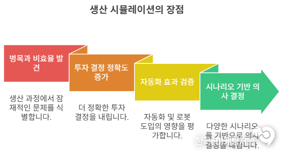 두 번째 장점은 설비 투자 결정의 정확도 증가이다. 새로운 설비를 구매하기 전에 시뮬레이션을 통해 생산량 변화, 라인 밸런싱 효과, 리드타임 단축 정도를 미리 계산할 수 있다. 이는 중소 제조업에 특히 중요하다. 예산이 한정된 상황에서 '감'이 아닌 '데이터'로 투자 결정을 할 수 있기 때문이다.