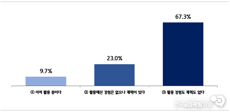2. 현사업장에서의 AI활용 여부 또는 계획 유무 : 응답자의 67.3%가 “AI 활용 경험도 계획도 없다”고 답했다. 반면 실제 활용 중인 기업은 9.7%, 향후 도입 계획이 있는 기업은 23%에 그쳤다.
