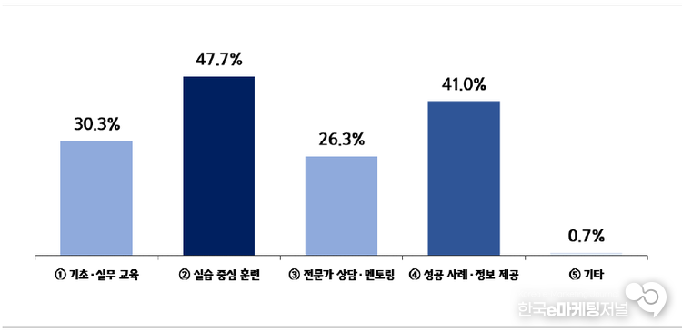4. AI를 활용하기 위해 가장 필요한 지원 : 소상공인들은 AI 활용 확대를 위해 ‘실습 중심 훈련’(47.7%)과 ‘성공사례·정보 제공’(41%), ‘기초·실무 교육’(30.3%)이 필요하다고 응답했다.
