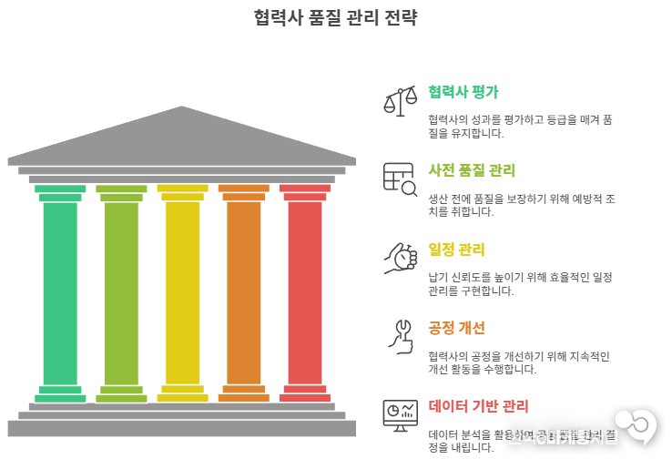 첫 번째 전략은 협력사 평가 및 등급 관리이다. 품질 수준, 납기 준수율, 가격 경쟁력, 기술력, 개선 의지 등을 기준으로 협력사를 정기 평가하고 등급을 부여해야 한다. 이는 단순 평가가 아니라 위험을 사전에 파악하고 개선 우선순위를 정하는 도구이다.