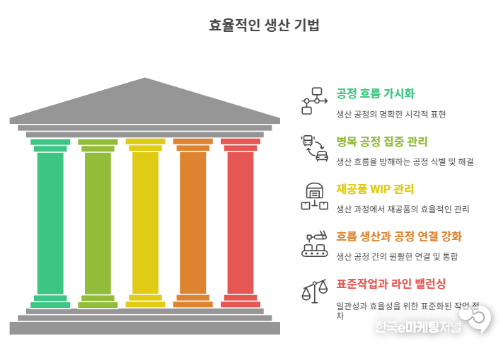 다섯 번째는 표준작업과 라인 밸런싱이다. 공정별 작업 편차를 줄이고 작업량을 균형 있게 배분하면 공정 간 정체가 사라진다. 이는 추가 투자 없이도 즉각적인 효과를 낼 수 있는 실천적 방법이다.