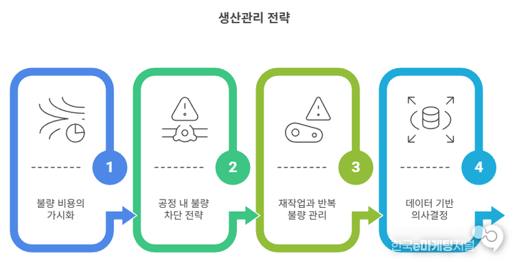 생산관리의 첫 번째 전략은 불량 비용의 가시화이다. 많은 기업이 불량률은 관리하지만, 불량으로 얼마의 비용이 발생했는지는 정확히 계산하지 않는다. 재작업 시간, 추가 인력 투입, 납기 지연 패널티를 금액으로 환산하면 불량의 심각성이 명확해진다. 숫자로 보이지 않는 문제는 개선되지 않는다.