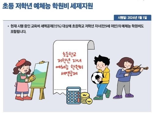 새해부터는 초등학교 저학년 자녀(만 9세 미만)의 예체능 학원비도 ‘교육비 세액공제’ 대상에 포함된다. 이는 기존에 정규 교육비로만 인정되던 학원비 범위를 넓혀 학부모의 부담을 줄이기 위한 조치다. 특히 초등 2학년 이하 자녀가 받는 음악·미술·체육 등 과외 활동 비용도 공제 대상으로 명시된다.