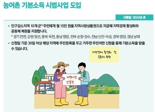 정부는 인구 감소 지역 10개 군 거주자에게 1인당 월 15만 원의 ‘농어촌 기본소득’을 지급하는 정책을 신설한다. 해당 기본소득은 지방 소멸 위기 대응과 지역 경제 활성화를 위해 도입되는 것으로, 지역화폐(지역사랑상품권) 형태로 지급된다.