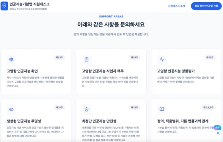 AI기본법은 인공지능 기술 개발과 활용을 촉진하면서 동시에 안전성과 신뢰성을 확보하기 위한 법적 기반을 마련한 것이 특징이다. 이에 따라 산업계에서는 법 해석과 적용, 기술적 대응 방안 등 실무적인 고민이 많다. 지원데스크는 이러한 기업 현장의 어려움을 해결하기 위해 법·제도와 기술 분야 전문 인력을 투입해 정확하고 신속한 상담을 제공한다. 일반적인 상담은 평일 기준 72시간 이내 답변을 목표로 하며, 복잡한 사안이나 법적 검토가 필요한 경우에는 최대 14일 이내 회신이 이루어진다. 상담 내용은 모두 비공개로 처리돼 기업들의 민감 정보가 보호된다.