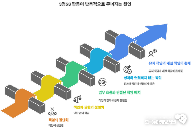 네 번째는 성과와 연결되지 않는 책임이다. 3정5S 책임을 맡아도 평가, 피드백, 성과 관리와 연결되지 않으면 우선순위는 자연스럽게 낮아진다. 생산성과 품질 지표만 관리하고 3정5S 결과를 반영하지 않으면, 현장은 이를 부가 업무로 인식한다. 책임은 반드시 성과 관리 체계와 연동되어야 지속된다.