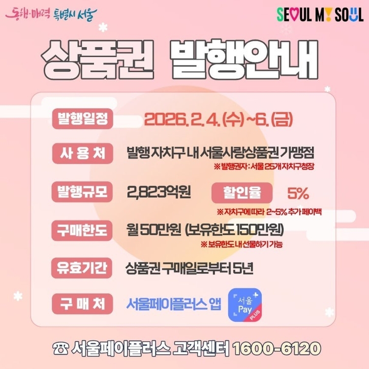 이번 발행 규모 3,073억원은 자치구에서 사용할 수 있는 서울사랑상품권 2,823억원과 공공배달앱 전용 ‘배달전용상품권’ 250억원으로 구성된다. 상품권은 2월 3일부터 6일까지 자치구별로 순차 발행되며 서울페이플러스(SeoulPay+) 앱을 통해 구매 가능하다.