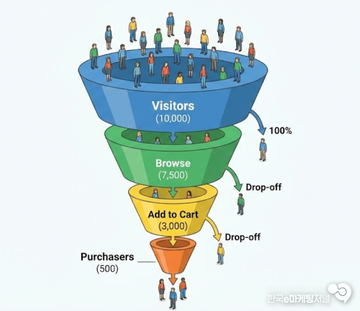 온라인 쇼핑몰에 접속한 100명의 사람 중 실제로 물건을 사는 사람은 몇 명이나 될까. 처음에는 많은 사람이 호기심에 사이트를 방문하지만 상품을 검색하고 장바구니에 담고 결제 버튼을 누르는 각 단계를 거칠 때마다 사람들의 수는 점점 줄어든다.
