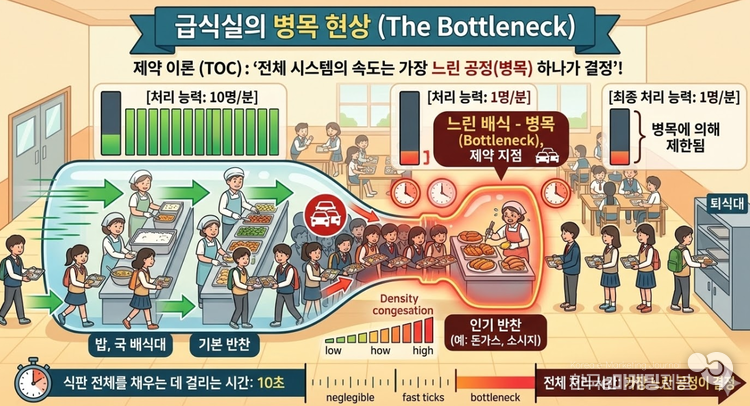 밥을 1초 만에 아무리 빨리 퍼준다고 해도, 고기반찬을 나눠주는 데 10초가 걸린다면 결국 학생 한 명이 식판을 다 채우는 데 걸리는 시간은 10초가 된다. 생산관리에서는 이를 '병목 현상(Bottleneck)'이라고 부른다.
