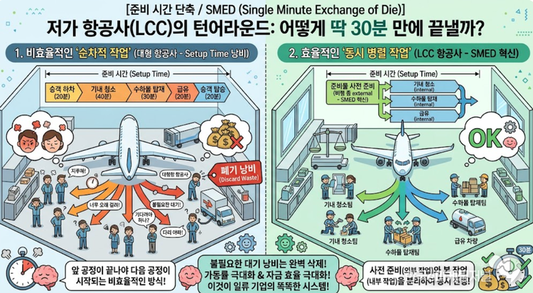 대형 항공사들이 보통 1시간에서 길게는 2시간까지 걸리는 이 '턴어라운드(Turnaround, 지상 체류)' 과정을 저가 항공사들은 단 30~40분 만에 끝내버린다. 대충 하는 것도 아닌데 어떻게 이런 속도가 가능할까? 경영학과 생산관리에서는 이를 'SMED(Single Minute Exchange of Die, 준비 시간 단축)'라는 극한의 공정 개선 기법으로 설명한다.