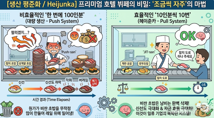 결국 팔리지 않은 고기는 버려지게 된다(재고 낭비). 반면, 손님이 몰리는 정오에는 조금 더 자주 굽고, 한산한 오후 2시에는 굽는 횟수를 줄이는 식으로 생산 속도를 수요에 맞춰 일정하게 평평하게(Leveling) 만들면, 재고가 쌓일 틈이 없고 손님은 항상 최상의 품질을 경험하게 된다.