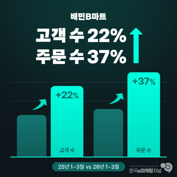 우아한형제들은 2026년 1분기 B마트 주요 지표가 모두 증가하며 사상 최대 분기 성과를 달성했다고 밝혔다. 주문 수는 전년 동기 대비 37% 증가했고, 고객 수와 거래액도 각각 22%, 36% 늘었다. 이는 분기 기준으로 역대 최고 수준이다.
