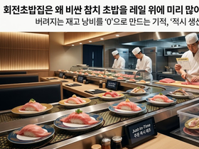 회전초밥집에 가면 재미있는 규칙을 하나 발견할 수 있다. 계란 초밥이나 유부초밥처럼 저렴한 메뉴는 레일 위를 끊임없이 돌고 있지만, 비싼 참치 뱃살(도로)이나 성게알 초밥은 좀처럼 구경하기 힘들다. 먹고 싶다면 셰프에게 직접 주문을 해야만 그 자리에서 바로 쥐어준다. 단순히 비싼 재료를 아끼려는 걸까? 생산관리 관점에서 이 현상은 세계 1위 자동차 기업 도요타의 핵심 생산 철학인 '적시 생산 방식(JIT, Just-In-Time)'을 가장 완벽하게 보여주는 사례다. JIT란 문자 그대로 '필요한 것을, 필요한 때에, 필요한 만큼만' 생산하는 방식을 말한다. 만약 셰프가 참치 초밥을 미리 잔뜩 만들어 레일 위에 올려둔다고 가정해 보자(밀어내기식 생산, Push System). 운 좋게 손님들이 다 먹어주면 다행이지만, 손님이 찾지 않아 시간이 한참 지나버리면 초밥은 신선도를 잃고 결국 쓰레기통으로 직행해야 한다. 저렴한 계란 초밥 하나를 버리는 것은 감당할 수 있는 손실이지만, 원가가 비싼 참치 초밥을 버리는 것은 식당 입장에서 엄청난 타격, 즉 막대한 '재고 폐기 비용(낭비)'을 의미한다. 이러한 치명적인 낭비를 막기 위해 회전초밥집은 비싼 메뉴에 한해 철저