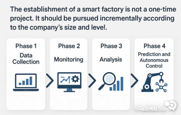 스마트팩토리 구축은 한 번에 완성되는 프로젝트가 아니다. 기업의 규모와 수준에 따라 단계적으로 추진해야 한다. 일반적으로는 1단계(데이터 수집) → 2단계(모니터링) → 3단계(분석) → 4단계(예측 및 자율제어) 의 과정을 거친다.