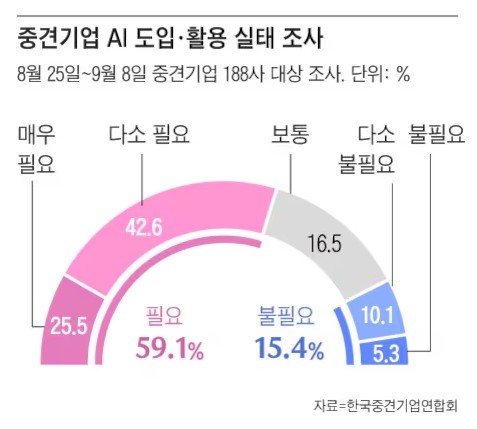 중견기업 10곳 중 6곳(59.1%)이 인공지능(AI)을 ‘미래 생존의 필수 조건’으로 인식하고 있지만, 실제 도입률은 2곳(18.1%)에도 미치지 못하는 것으로 나타났다.