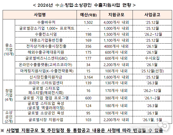 중소벤처기업부는 2026년 중소기업의 글로벌 시장 진출을 체계적으로 돕기 위한 수출지원사업 통합공고를 발표했다.