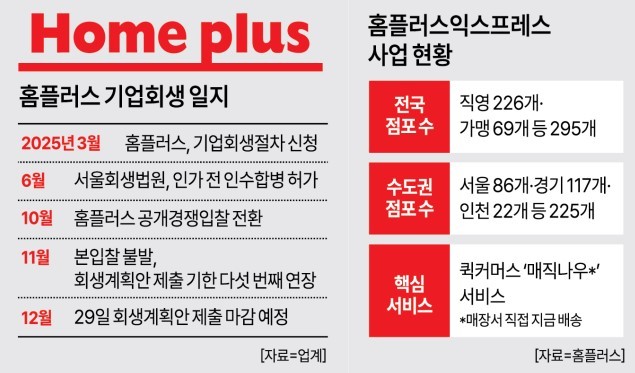 26일 유통업계에 따르면 홈플러스는 오는 29일 서울회생법원에 홈플러스 익스프레스 사업부 분리 매각과 인가 후 인수합병(M&A) 절차를 포함한 구조혁신형 회생계획안을 제출할 예정이다. 이번 계획안에는 기존 사업 구조를 조정해 회생 가능성을 높이기 위한 방안이 담길 것으로 알려졌다.