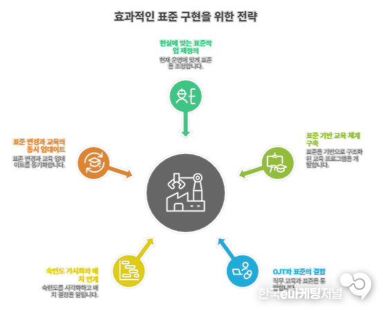 첫 번째 전략은 현실에 맞는 표준작업 재정의이다. 책상에서 만든 표준은 현장에서 지켜지지 않는다. 실제 숙련 작업자의 동작, 공구 사용 순서, 주의 포인트를 반영해 표준을 재정비해야 한다. 표준은 가장 빠른 방법이 아니라, 가장 안정적인 방법이어야 한다.