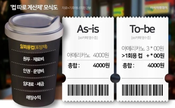 앞으로 카페에서 음료를 구매하면 영수증에 음료 가격과 일회용 컵 가격이 별도로 표시될 전망이다. 플라스틱 사용에 따른 비용을 소비자가 직접 인식하도록 해 다회용 컵 사용을 유도하겠다는 취지다.
