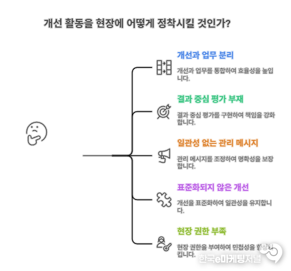 이는 현장의 의지 부족이 아니라, 개선이 정착되기 어려운 조직 구조에 원인이 있다. 개선 활동이 실패하는 이유는 대부분 비슷한 패턴을 가진다.