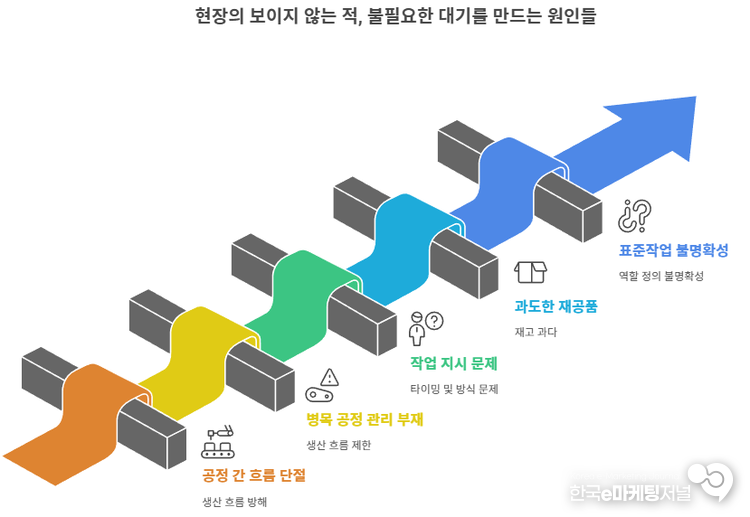 두 번째는 병목 공정 중심 관리의 부재이다. 모든 공정을 동일하게 관리하면, 병목이 아닌 공정에서 과잉 생산이 발생하고 재공품이 쌓인다. 그 결과 병목 이후 공정은 자재를 기다리며 대기하게 된다. 대기시간은 병목을 기준으로 관리하지 않을 때 자연스럽게 늘어난다.