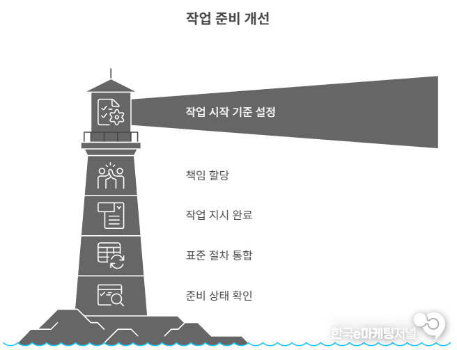 마지막으로 준비 상태를 확인하는 관리 체계의 부재가 문제를 키운다. 작업 시작 전 준비 상태를 점검하는 절차가 없으면, 문제는 작업 중에 드러난다. 이는 중단, 재이동, 재지시로 이어지며 생산성을 크게 떨어뜨린다.