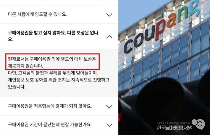 쿠팡은 개인정보 유출 피해를 입은 이용자들에게 1인당 5만원 규모의 구매이용권을 1월 15일부터 순차적으로 지급하기 시작하였다. 그러나 이 이용권의 사용 기한은 오는 4월 15일까지로 약 3개월에 불과하여, 소비자들이 기한 내에 5만원을 온전히 사용하기 어렵다는 지적이 제기되고 있다. 또한, 이용권 사용 시 잔액이 남을 경우 소멸되거나, 특정 상품군 및 포장 서비스 등에서 사용이 제한되는 등의 조건이 붙어 실질적인 보상 효과가 미미하다는 비판이 크다.