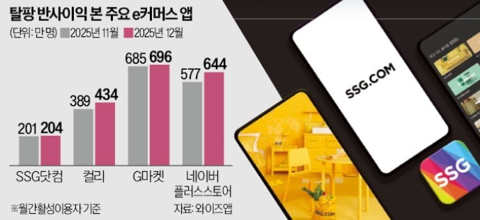 SSG닷컴 역시 반사 수혜를 누리고 있다. 이달 1일부터 15일까지 SSG닷컴의 일평균 신규 방문자 수는 전년 동기 대비 330% 증가했으며, 쓱배송 첫 주문 회원 수도 53% 늘어났다. 같은 기간 쓱배송 주문 건수는 지난해 12월 동기 대비 15% 증가해 신규 유입이 실제 구매로 이어지는 흐름이 확인됐다. 최근 선보인 신규 멤버십 서비스가 고객 유입과 재구매를 동시에 견인하고 있다는 분석이다.