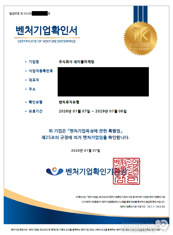 소상공인 및 중소기업을 위한 통합 비즈니스 솔루션을 제공하는 (주)네이블마케팅이 벤처기업 인증을 획득하며 기술력과 미래 성장 가능성을 공식적으로 인정받았다.