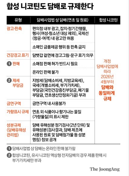이번 개정안의 핵심은 담배의 정의를 기존 ‘연초의 잎’에서 ‘연초 또는 니코틴’으로 확대했다는 점이다. 이에 따라 연초의 잎에서 유래하지 않은 합성니코틴 제품이라 하더라도 국민건강증진법상 담배로 분류되며, 액상형 전자담배 역시 관리 대상에 포함된다. 그동안 합성니코틴 전자담배는 상대적으로 규제의 사각지대에 놓여 있었으나, 이번 법 개정으로 제도권 관리가 가능해졌다.