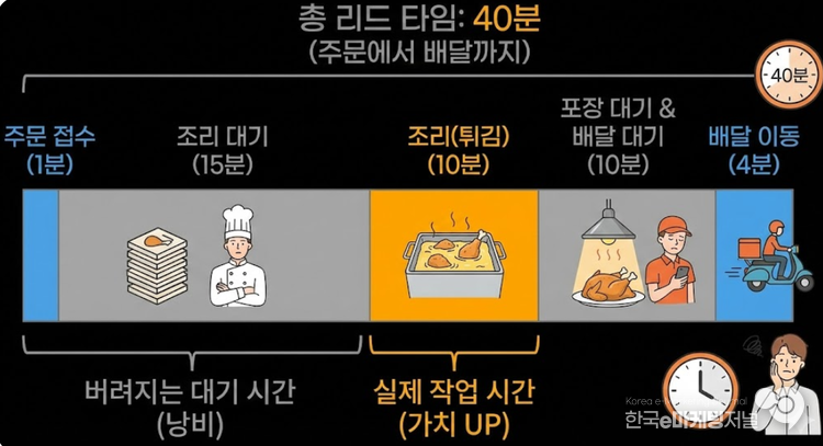 여기서 중요한 것은 튀기거나 포장하는 실제 작업 시간보다, 앞선 주문이 밀려 튀김기 앞에서 대기하는 시간이나 완성된 치킨이 배달원을 기다리는 시간이 훨씬 길다는 점이다. 생산관리에서는 제품의 가치를 직접 높이는 시간과 단순히 머물러 있는 '대기 시간'을 엄격하게 구분한다.