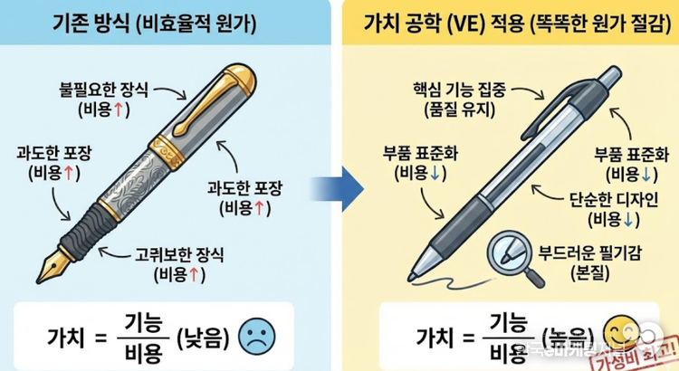 가치 공학은 무작정 원가를 줄이는 것이 아니라, 제품의 본질적인 기능에 집중하는 방식이다. 물건의 가치는 기능과 비용의 비율로 결정된다. 즉, 비용을 낮추면서도 고객이 원하는 기능을 유지하거나 향상시킬 때 제품의 가치는 극대화된다.