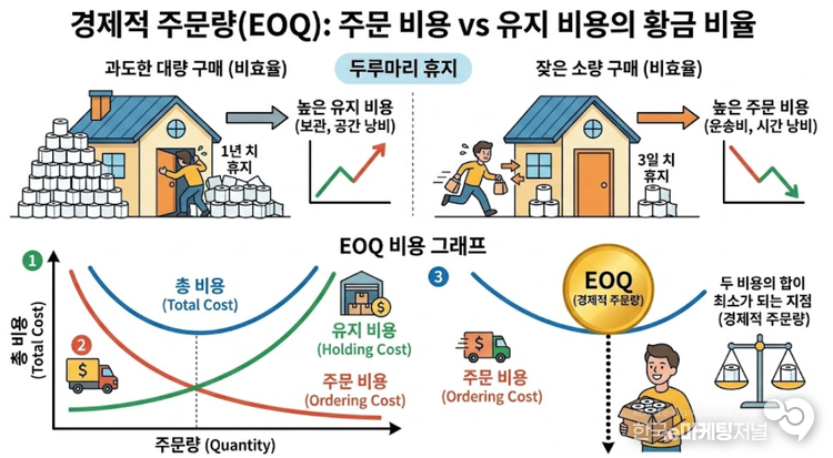 공장에서 물건을 만들기 위해 원자재를 주문할 때는 크게 두 가지 비용이 발생한다. 첫째는 주문할 때마다 드는 서류 작업, 운송비, 하역비 같은 주문 비용이다. 둘째는 사온 원자재를 창고에 보관하면서 발생하는 임대료, 보험료, 창고 관리비, 그리고 그 돈을 은행에 넣었을 때 받을 수 있는 이자를 포기하는 기회비용을 합친 유지 비용이다.