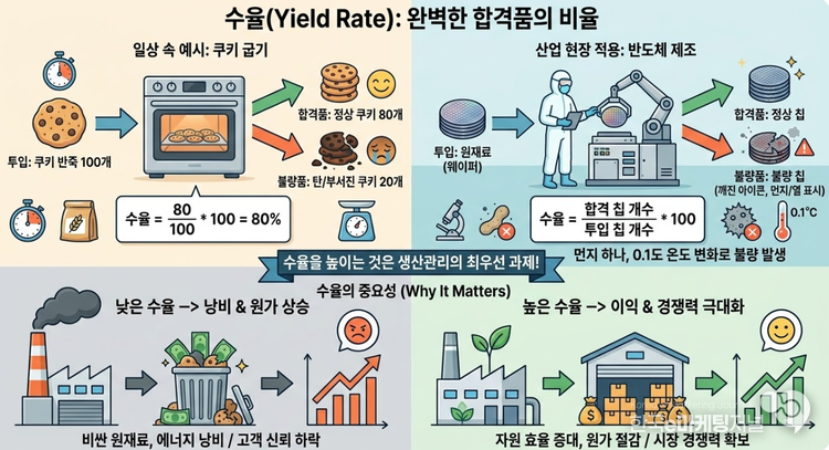 일상생활에서 쿠키 몇 개를 망치는 것은 조금 아쉽고 말 일이지만, 기업의 생산 현장에서 수율은 회사의 목숨줄을 쥐고 있는 핵심 지표다.