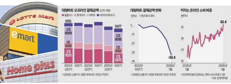 대체 데이터 플랫폼 한경에이셀(Aicel)에 따르면 이마트·트레이더스·롯데마트·홈플러스 4개 브랜드 오프라인 매장의 신용카드 결제금액(추정치)은 지난해 12월 28일부터 이달 14일까지 약 7주 간 2조2347억원으로 집계됐다. 이는 1년 전 같은 기간 3조554억원과 비교해 14.4% 감소한 수치다. 대형마트 오프라인 결제액은 2023년 이후 4년 연속 역성장을 기록하고 있다. 지난해 연간 결제액은 전년 대비 11.0% 감소해 2023년(-0.81%)과 2024년(-0.19%)보다 감소폭이 확대됐다.