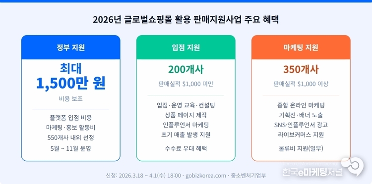 '2026년 글로벌쇼핑몰 활용 판매지원사업'은 전 세계에 온라인 판매망을 갖춘 글로벌 플랫폼을 활용해 국내 중소기업의 해외 시장 개척을 체계적으로 뒷받침하는 사업이다. 플랫폼 입점부터 우수 제품 홍보, 마케팅 활동에 이르는 전 과정을 정부와 글로벌 플랫폼사가 함께 지원하는 방식으로 운영된다. 사업 기간은 선정일부터 2026년 11월 30일까지다.