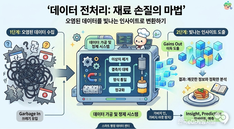 결국 데이터 전처리는 요리를 하기 전 식재료를 손질하는 과정과 같다. 신선하지 않은 재료를 그대로 냄비에 넣으면 아무리 일류 요리사라도 좋은 맛을 낼 수 없다. 데이터 분석 역시 마찬가지이다. 겉으로 보기에는 화려해 보이지 않는 지루한 전처리 과정이 뒷받침될 때 비로소 우리는 데이터 속에 숨겨진 진정한 의미와 정확한 예측 결과를 얻어낼 수 있다.