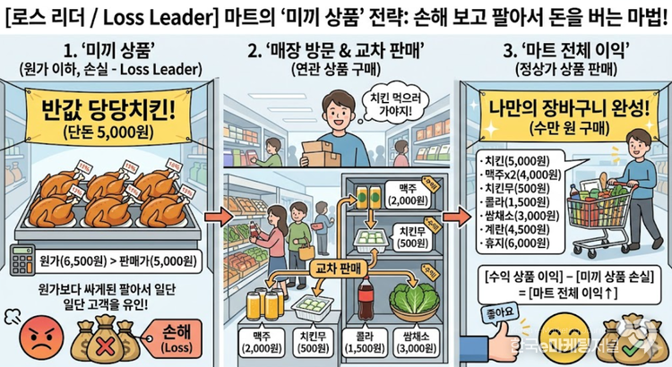 팔면 팔수록 오히려 마트가 손해를 보는 구조인데, 대기업들은 왜 이런 바보 같은 장사를 하는 걸까? 경영학과 유통 관리에서는 이를 '로스 리더(Loss Leader, 특매 상품 혹은 미끼 상품)'라는 아주 영리한 전략으로 설명한다.