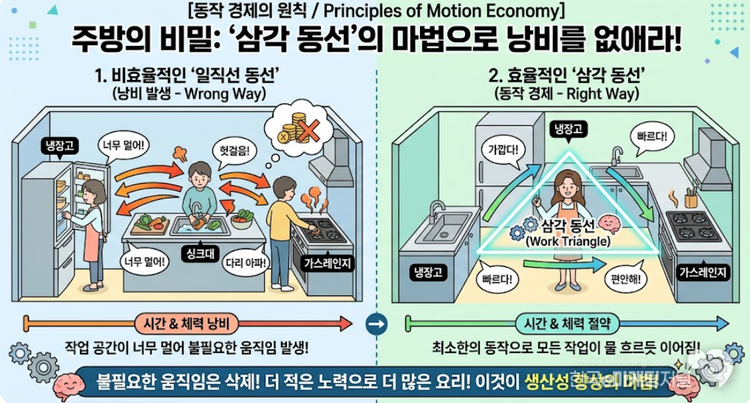 주방의 '삼각 동선' 역시 이 길브레스 부부의 원리가 그대로 적용된 작업 표준화의 결과물이다. 만약 냉장고, 싱크대, 가스레인지가 일직선으로 너무 멀리 떨어져 있다면, 요리하는 사람은 찌개 하나를 끓이기 위해 주방 끝에서 끝까지 수십 번을 헛걸음하며 체력을 낭비해야 한다. 하지만 이 세 가지 핵심 작업 공간을 세 걸음 이내의 삼각형으로 묶어두면, 몸만 살짝 돌려도 모든 작업이 물 흐르듯 이어지게 된다.