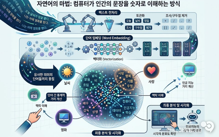 단순히 글자를 입력받는 것을 넘어 의미를 파악하기 위해서는 먼저 텍스트를 정제하는 전처리 과정이 필요하다. 문장에서 의미 없는 조사나 구두점을 제거하고 단어의 뿌리가 되는 어근만을 남기는 토큰화 작업을 거친다.