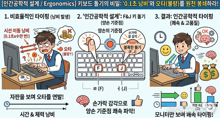 과거 키보드가 없던 시절, 타자기로 글을 치던 작업자들에게 가장 큰 고민은 '오타(불량)'였다. 오타를 줄이려면 자판을 일일이 눈으로 확인하며 쳐야 했는데, 이는 작업 속도를 엄청나게 떨어뜨리는 '시간 낭비'를 가져왔다. 반대로 자판을 보지 않고 화면(모니터)만 보며 빠르게 치는 '자리 연습'을 하자니, 손가락이 자판 위에서 길을 잃어 엉뚱한 키를 누르기 일쑤였다. 이때 인간공학자가 제시한 해결책이 바로 'F'와 'J' 키 위의 돌기였다.