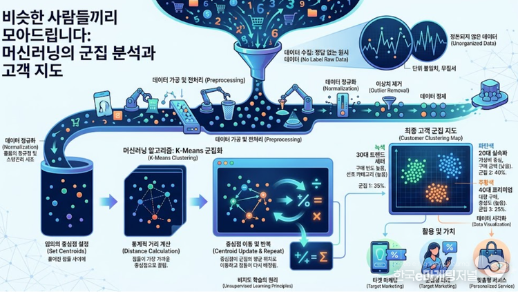 이러한 거리 계산이 정확하게 이루어지기 위해서는 데이터 전처리가 필수적이다. 나이, 구매 금액, 방문 횟수 등 단위와 크기가 전혀 다른 데이터들을 그대로 사용하면 왜곡이 발생하기 때문이다. 따라서 모든 수치를 일정한 기준으로 맞추는 정규화 작업을 거쳐야만 인공지능이 거리를 공평하게 측정할 수 있다. 이렇게 가공된 숫자들은 다차원의 공간에서 서로 끌어당기고 밀어내며 서서히 자신만의 군집을 형성하게 된다.