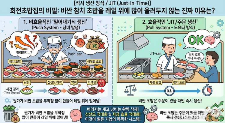 JIT란 문자 그대로 '필요한 것을, 필요한 때에, 필요한 만큼만' 생산하는 방식을 말한다. 만약 셰프가 참치 초밥을 미리 잔뜩 만들어 레일 위에 올려둔다고 가정해 보자(밀어내기식 생산, Push System).