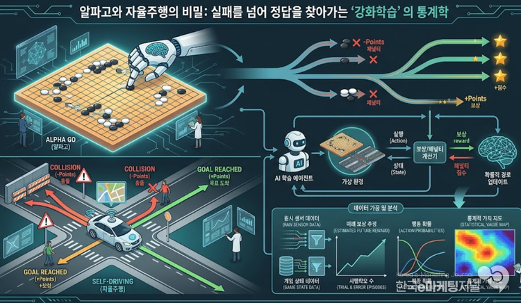 결국 강화학습은 실패라는 거친 원시 데이터를 가공하여 성공이라는 정답으로 바꾸는 고도의 통계적 연금술이다. 주입된 데이터의 한계를 벗어나 스스로 진화하는 이 데이터 가공 기술 덕분에, 컴퓨터는 이제 바둑판의 무한한 경우의 수를 정복하고 복잡한 도심 한복판을 스스로 판단하며 질주할 수 있게 되었다. 경험 데이터가 축적될수록 인공지능이 그리는 미래의 지도는 더욱 정교해질 것이다.