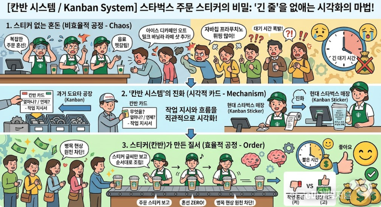 만약 이 스티커(칸반)가 없다면 어떻게 될까? 주문이 조금만 밀려도 누가 어떤 커피를 시켰는지 혼선이 빚어지고, 잘못 만든 음료를 버려야 하며, 결국 대기 줄은 걷잡을 수 없이 길어질 것이다. 칸반 시스템의 위대함은 눈에 보이지 않는 복잡한 작업 지시와 정보의 흐름을 누구나 직관적으로 볼 수 있게 '시각화(Visual Workflow)'하여, 공정 간의 오해와 병목 현상을 원천적으로 차단한다는 데 있다. 작은 스티커 한 장이 혼돈의 카페를 완벽하게 통제되는 거대한 컨베이어 벨트로 바꾸어 놓은 셈이다.