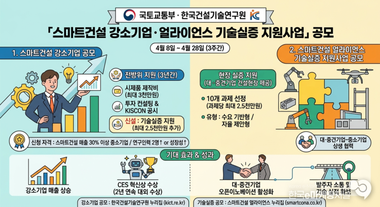 국토교통부(장관 김윤덕)와 한국건설기술연구원(원장 박선규)은 혁신적인 스마트건설 중소기업 육성과 산업 생태계 조성을 위해 「스마트건설 강소기업 공모」와 「스마트건설 얼라이언스 기술실증 지원사업 공모」를 4월 8일부터 28일까지 3주간 실시한다고 밝혔다. 올해부터는 지원금액 등 혜택을 대폭 확대해 건설AI·건설로봇 등 개발 과정이나 시장진입 단계에서 어려움을 겪는 중소기업들에게 실질적인 도움이 될 것으로 기대된다.