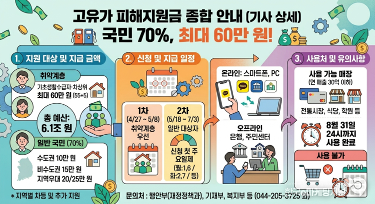 이번 고유가 피해지원금은 국민의 70%를 대상으로 소득계층별·지역별로 1인당 10만 원에서 최대 60만 원까지 차등 지원하며, 총 예산 규모는 6.1조 원이다.