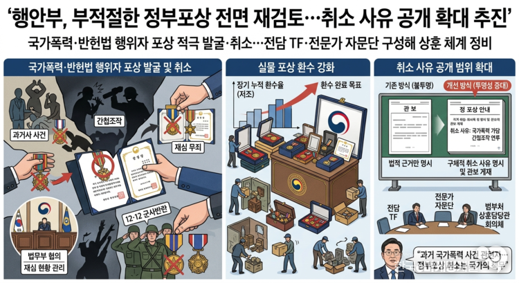 정부가 국가폭력 가해자나 반헌법적 행위자에게 수여된 부적절한 정부포상을 전면 재검토하고, 박탈된 상훈의 실물 환수와 취소 사유 공개 확대를 추진한다.